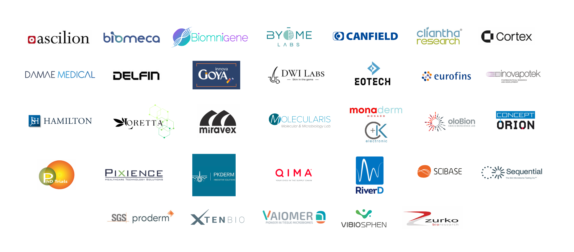 - Les partenaires de Tests (CRO): Biomnigene, Byome Labs, Dr Goya Analisis, DWI Labs, Eurofins Dermscan, Inovapotek, J.S Hamilton Poland, Loretta, Molecularis, oloBion, PhDTrials, PKDerm, SGS Proderm, Vibiosphen, Zurko research.