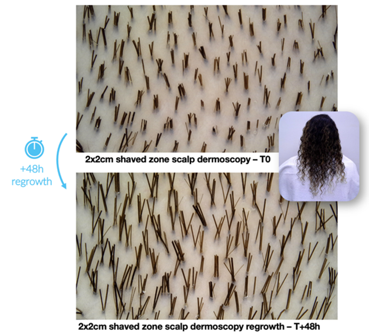 Among the available instrumental techniques, the phototrichogram (PTG) associated with dermoscopy remains one of the most reliable and widely used methods for the quantitative assessment of hair growth and scalp disorders. This non-invasive technique is based on the standardized shaving of a small scalp area, followed by high-resolution dermoscopic imaging performed at baseline (D0) and again after a 48-hour re-evaluation (D2).