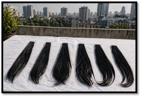 To replicate real-world conditions, standardized human hair swatches were subjected to multiple forms of controlled damage. These included repeated surfactant washes using sodium lauryl ether sulfate (SLES), thermal exposure through a straightening iron at 220°C, along with 30 minutes of exposure to UV radiation and automotive pollution.