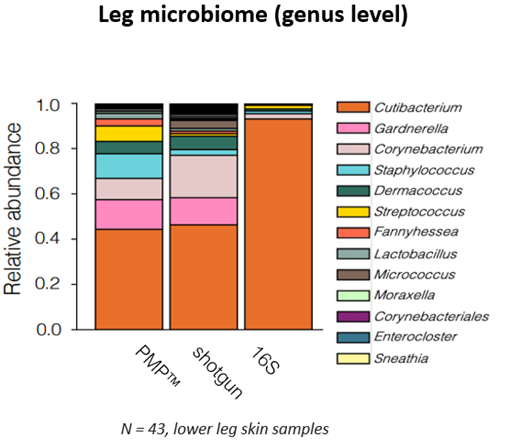 Independent validation from researchers at MIT compared PMP™ against both 16S and shotgun WGS across 43 human leg skin samples. The study demonstrated that PMP™ accurately captured microbial diversity at levels comparable to shotgun sequencing, while 16S sequencing failed to detect low-abundance genera, presenting a falsely Cutibacterium-dominant profile that misrepresented true community structure (figure 1).
