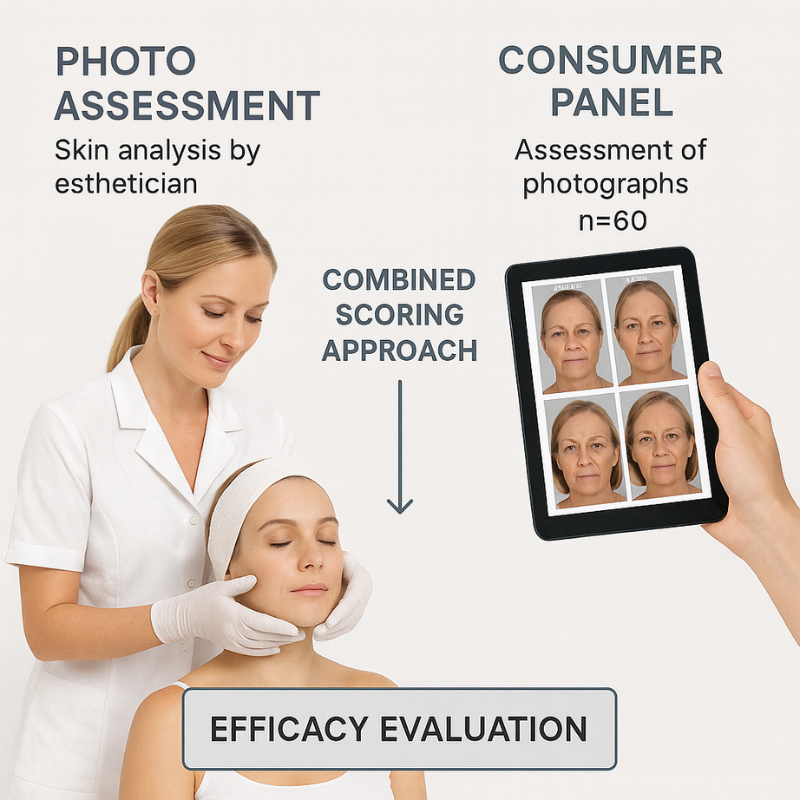 D’autre part, cette évaluation est enrichie par une analyse perceptive : un panel naïf composé de 60 participants examine des photographies de ces mêmes volontaires, prises avant et après traitement. Ce panel évalue des critères subjectifs tels que l’apparence générale, l’éclat du teint, ou encore l’estimation de l’âge perçu, afin de refléter la perception spontanée de l’efficacité du produit.